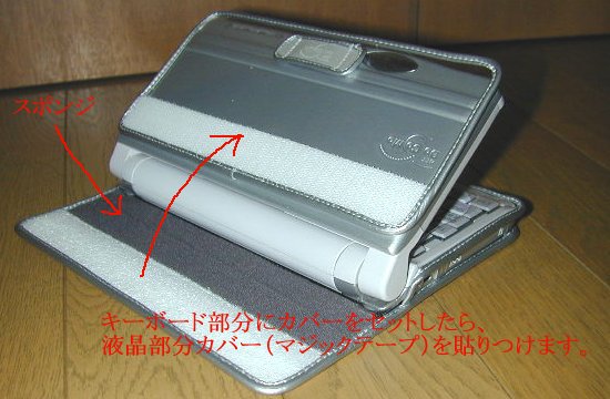| ■キーボード部分にカバーをセット 液晶部分、キーボード部分にカバーをセットし、貼りつけます。 キーボード側のマジックテープ手前側はスポンジになっていますのでジャストフィットします。 |
